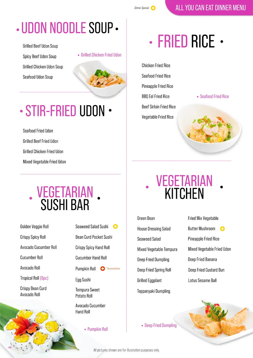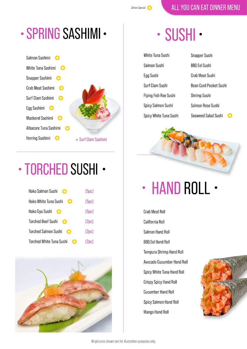 Welcome to Spring Sushi Toronto (4th Floor), a vibrant hub for sushi lovers located in the heart of downtown Toronto. The menu showcases an enticing selection of Japanese cuisine that spans impressive sushi rolls, sashimi, and a variety of hot dishes in an All-You-Can-Eat (AYCE) format. Visitors praise the freshness of the ingredients, highlighting the tender fish and expertly seasoned chicken.